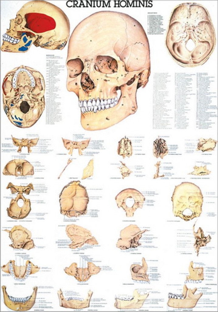 Plakatil on kujutatud koljut ja selle üksikuid luid. Vastavad struktuurid on nimetatud ladina keeles. Mõned sõnad on ka saksa keeles.