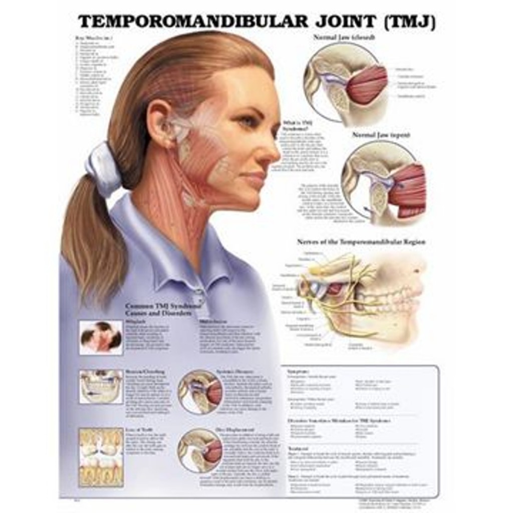 Illustreeritud on normaalne lõualuu avatud ja suletud asendis koos ümbritsevate närvidega, mis sageli probleeme põhjustavad. Plakat sisaldab loetelu sümptomitest ja muudest seisunditest, mida võib TJ-ga segi ajada. Näidatud on ka ravivõimalused.